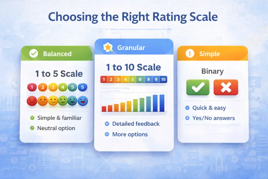 Choosing the right rating scale can make or break your feedback strategy. While the 1 to 5 rating scale dominates customer surveys and employee evaluations, it’s not the only option available. Understanding when and why to use a 1 to 5 rating scale—versus alternatives like 1 to 10 scales, yes/no questions, or star ratings—directly impacts response quality and business outcomes.
